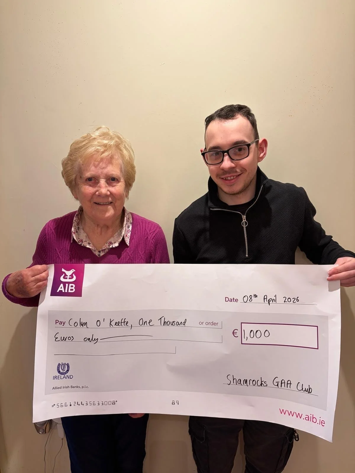 Numbers drawn on Monday 6th of April were 1,11,12,24. The Jackpot was €20,000. There was no jackpot winner. The €1,000 winner was Colm O'Keeffe The €20 winners were Emma O'Neill (Online), John Smith (Online), Ann Crawford, Michael Faul and Ollie Flanagan. Next week's jackpot is €20,000. Lotto tickets are on sale from promoters and online. Online tickets are available from the Club Force app (Shamrocks GAA club Waterford) to play the lotto. Also if you play the lotto on clubforce, it is worth checking that your ticket has not expired. There is also a link to the club force app on Shamrocks website. Your support is greatly appreciated. With the jackpot now €20,000 a reminder if you're not in, you can’t win.Congratulations to Colm O’Keeffe pictured receiving his €1,000 cheque from his grandmother Ann, on behalf of the club.